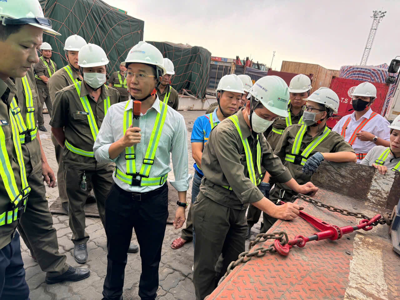 - Giảng viên hướng dẫn cách kiểm tra lực siết, điểm neo, và xử lý tình huống khi hàng bị lệch.